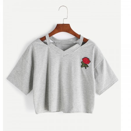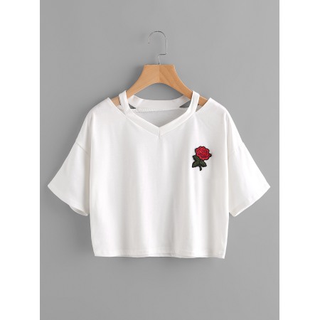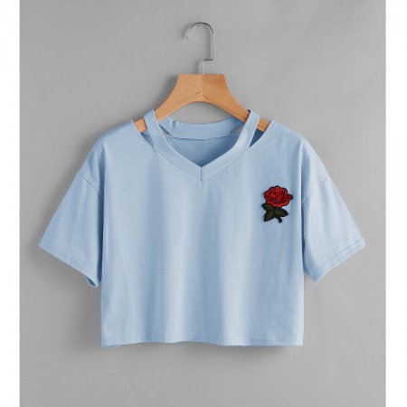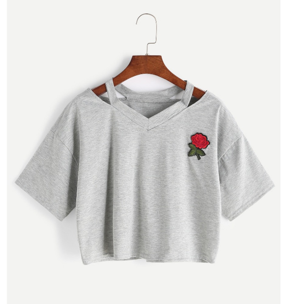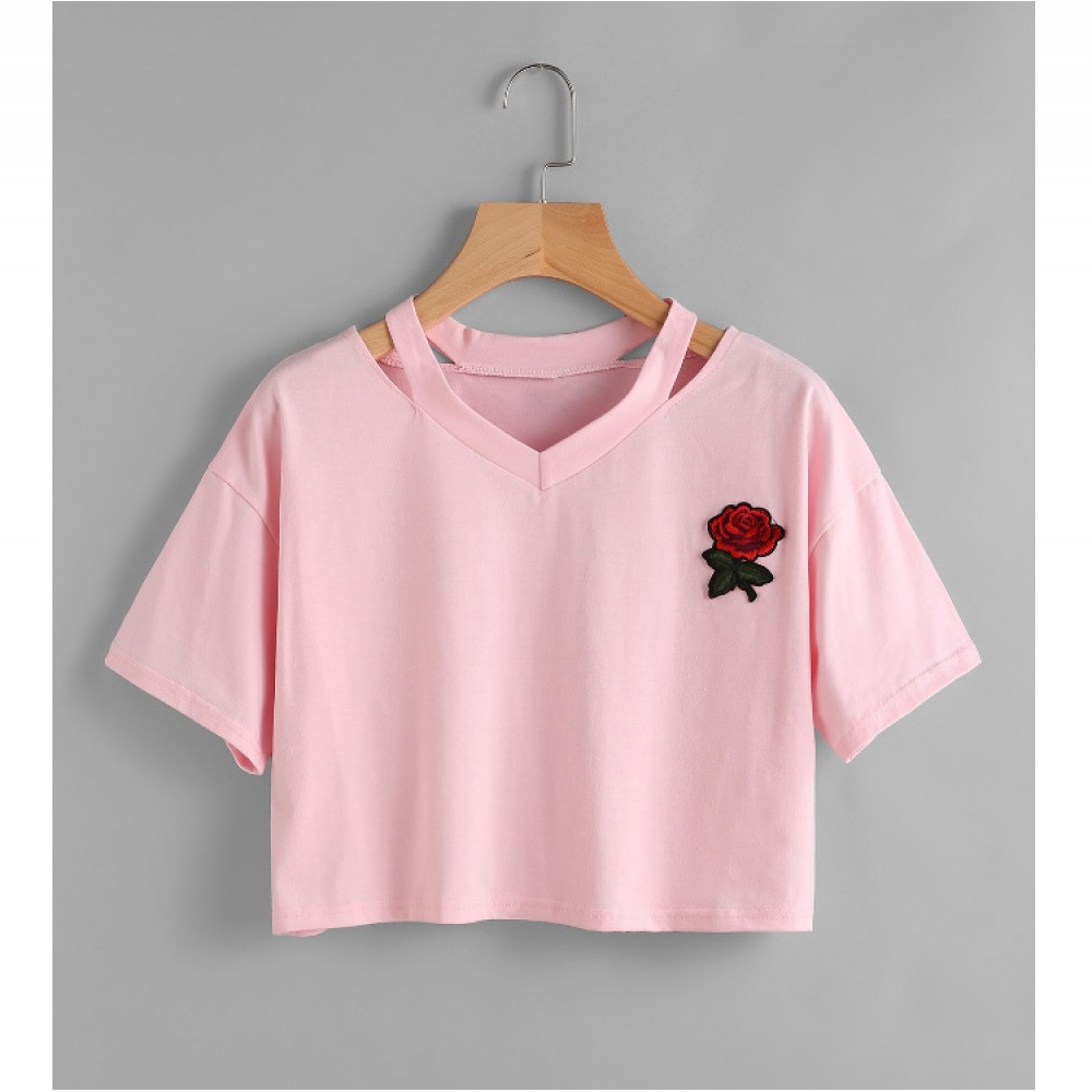 Sexy Embroidered Rose Flower Short T-Shirt